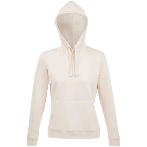 Sweat-shirt femme à capuche. Poche kangourou, coupé cousu. Capuche doublée avec cordon de serrage. Poignets et bas en bord côte 2x2. Demi-lune à l'intérieur du col, bande de propreté intérieur col. 80% coton Ringspun- 20% polyester. Intérieur gratté. Extérieur 100% coton. Grammage : 280g/m²